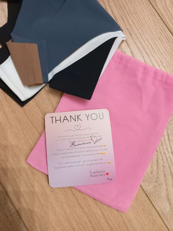 Білизна хорошої якості, приємна на дотик. Чудове пакування, мішечок знадобиться, щоб брати речі в подорож. Дякую за подаруночок та листівку. Це дуже приємно)