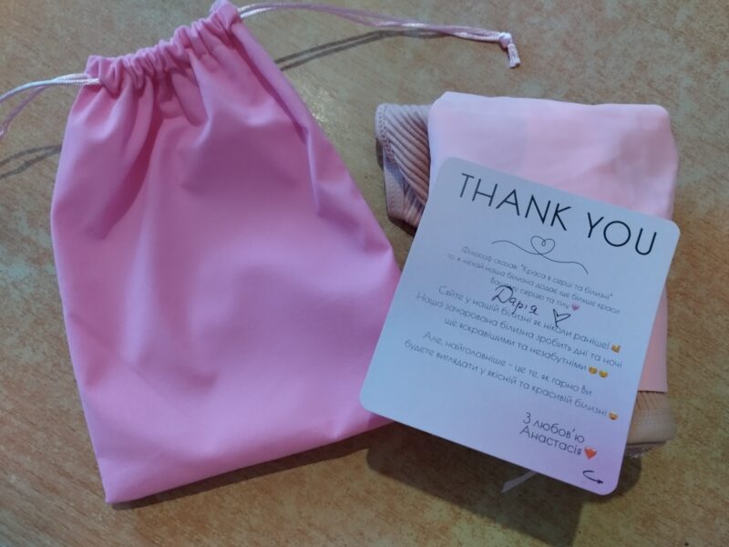 Боже, це так мило, так приємно:) Така красива упаковка – рожевий мішечок, ще листівочка із вписаним ім’ям покупця. Так настрій підняли ще до того, як розпакувала і роздивилася покупки:) І власне трусики дуже гарні, все, як і замовляла. Дякую!