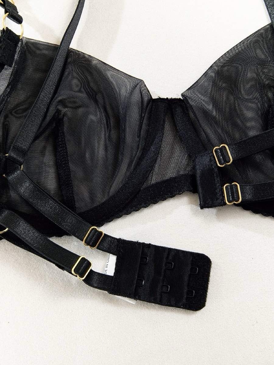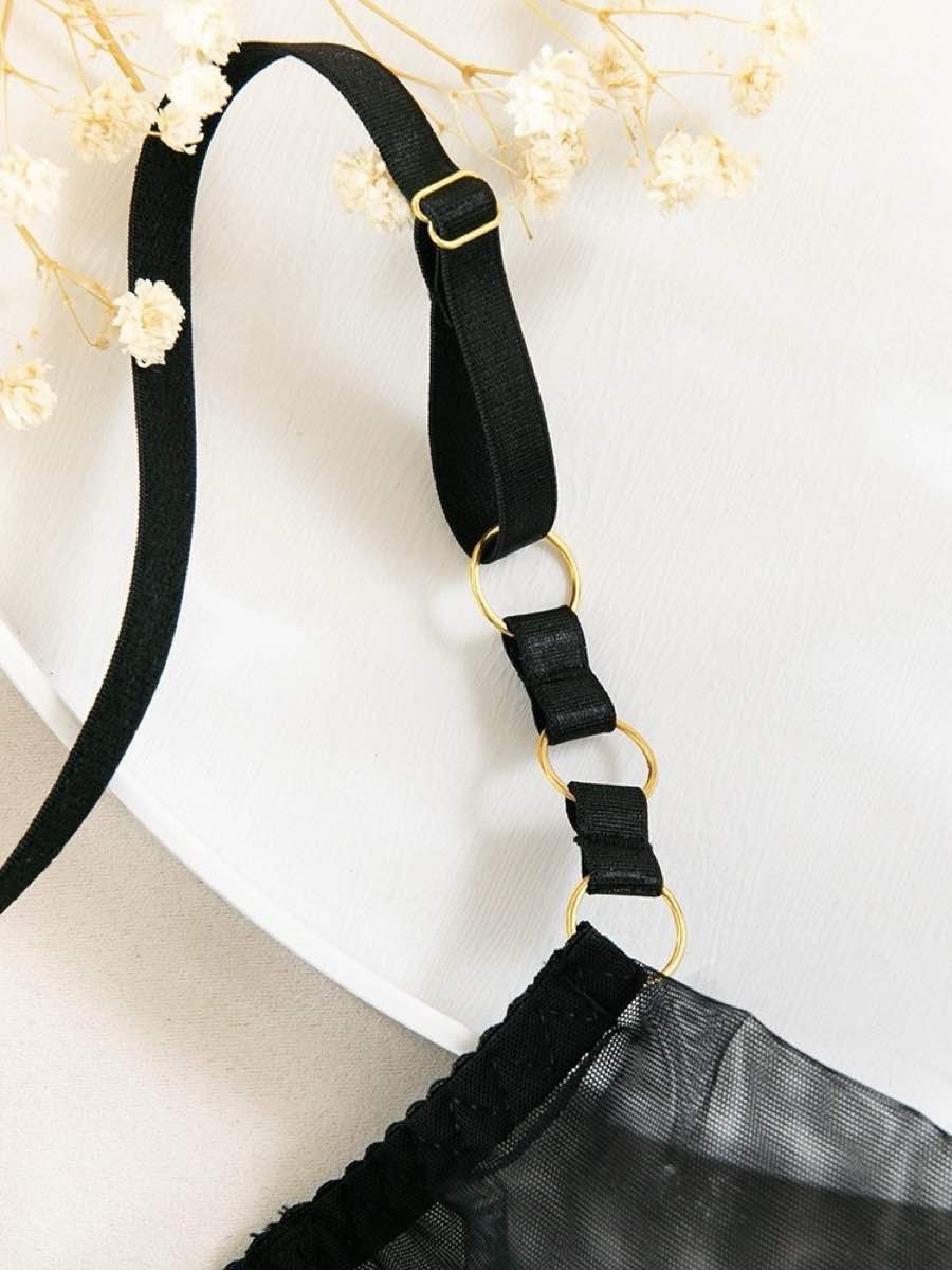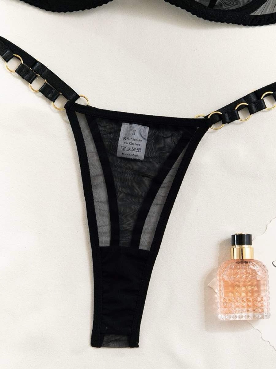 Цей жіночий прозорий комплект білизни з кільцями створений для жінок, які люблять відчувати себе привабливо, сміливо та впевнено. Прозора сітка делікатно огортає тіло, підкреслюючи природні лінії, а декоративні металеві кільця додають образу характеру й стильного акценту. Ідеальний баланс ніжності та звабливості.